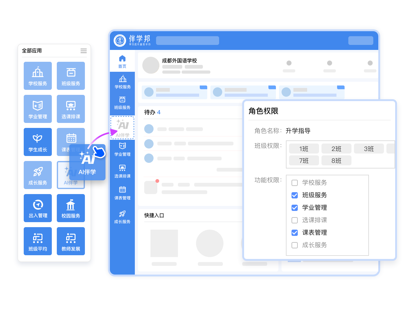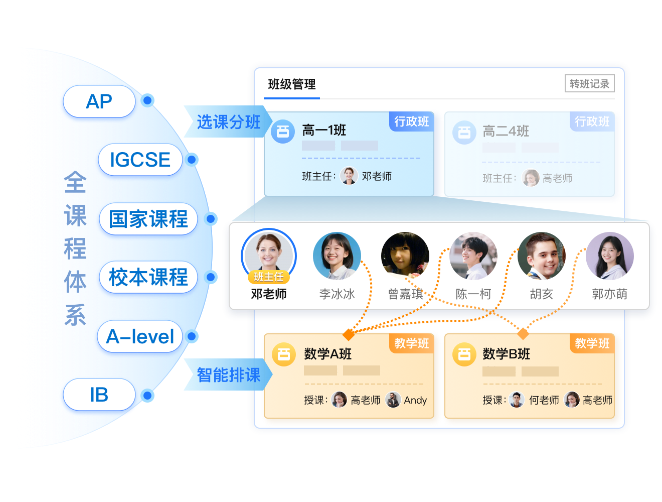 提供选排课、在线作业、分层教学、个性化学习、分析报告等学生成长服务